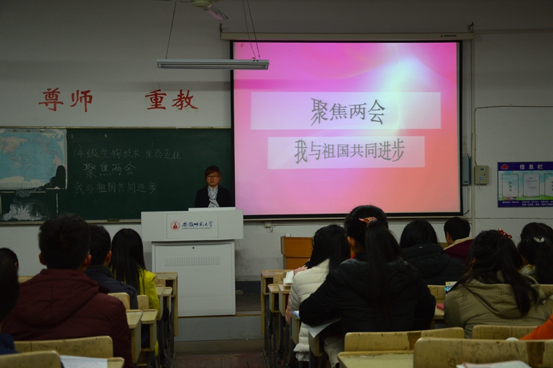 3月11日晚,生科院2014级生物技术、生态学专业以“聚焦两会,我与祖国共同进步”为主题在教学楼1303进行了两会视频观看与两会精神学习活动。胡璇同学以解说的形式带领同学们共同回顾了两会的发展历程,并向大家解说了一些两会小常识,让同学们认识到何为两会?两会召开的时间及往年的两会的部分热点问题。在辅导员张磊的主持下,生技生态专业的员工们对2015年两会热点八大猜想问题进行了讨论,并共同观看了《东方眼》小崔看两会的视频。