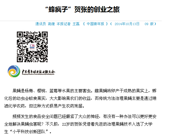 报道称,自2009年开始,生物技术专业的贺张在胡好远教授的指导下开始从事寄生蜂生物防治果蝇的研究。2013年,贺张和他的创业创新团队成功注册了“芜湖中贺生物技术有限公司”,公司所采用的“寄生蜂”生物防治果蝇实验在宁波市、余姚市、慈溪市等千亩杨梅园中得到推广,使杨梅园果蝇的数量减少了80%以上,得到当地政府部门和果农们的一致认可。今年9月份,贺张的“中贺生物创新团队”喜获老员工中国青少年科技创新奖“小平科技创新团队”荣誉称号。