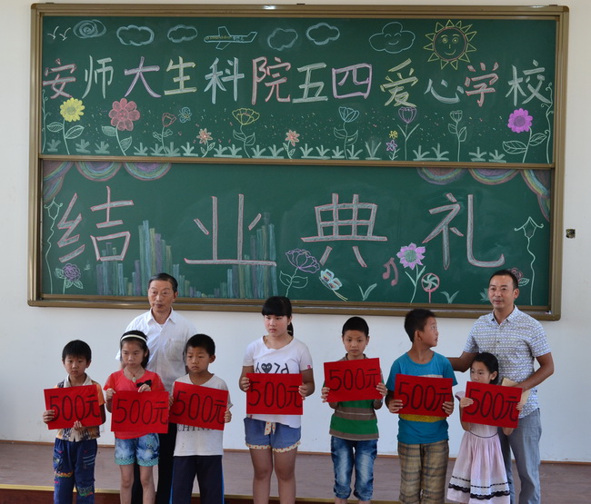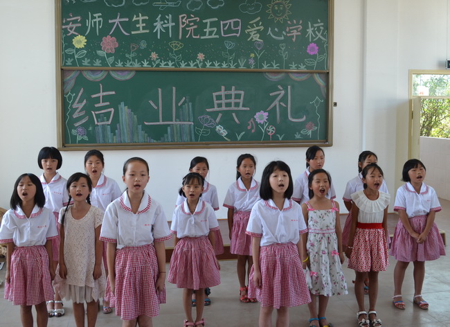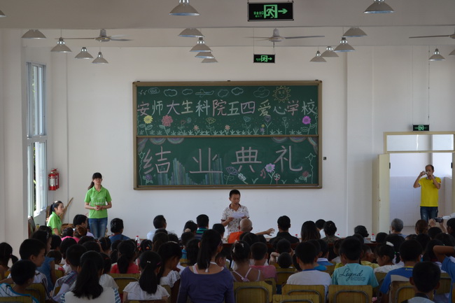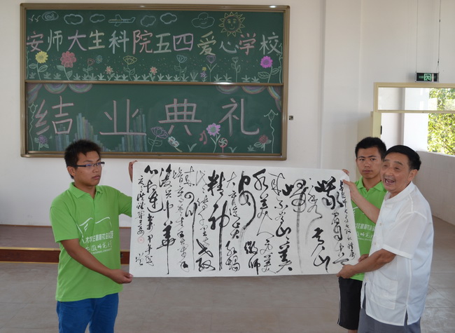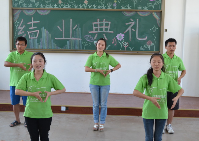 在结业典礼暨欢送仪式上,周明弟、余登富、刘友军对生科院“红烛行动”爱心支教活动给予了高度评价和赞扬,向支教师生们的辛苦付出和杰出表现致以崇高的敬意和深深的感激。洪雅县关工委特地以生科院爱心支教为题材撰写了诗歌并写成书法作品赠送给支教团队。“五四爱心公司”孩子们通过文艺演出展示了20多天的学习成果,抒发了对支教老师的敬爱和不舍。朗诵《奋斗》、舞蹈《幸福排手歌》、歌曲《爱》、小品《傻子上学》……每个节目都饱含了浓浓的师生情、绵绵的不舍意。志愿者张晓倩深情回顾了爱心支教的历程和取得的成果,代表全体志愿者向政府、公司对实践活动的大力支持和孩子们的良好表现表示了感谢。志愿者表演了诗朗诵《在支教的日子里》、手语舞《留给我们孩子一个干净的地球》,表达了支教的感受和对孩子们的美好祝福,同时将辛勤募捐到的爱心基金发放给需要帮助的孩子,受到与会领导、师生和员工家长的高度赞誉。