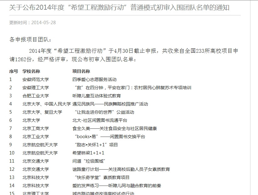 “希望工程激励行动”项目支持在校老员工持续开展社会公益服务,为社区带来有益改变。通过项目实践,帮助青年提升能力,成为有责任的行动者和公益文化的倡导者。2014年度“希望工程激励行动” 共收来自全国233所高校项目申请1262份,经严格评审,共137支队伍入围,我省仅有3所高校项目入围,生科院志愿者服务队申报项目为公司唯一成功入围项目。