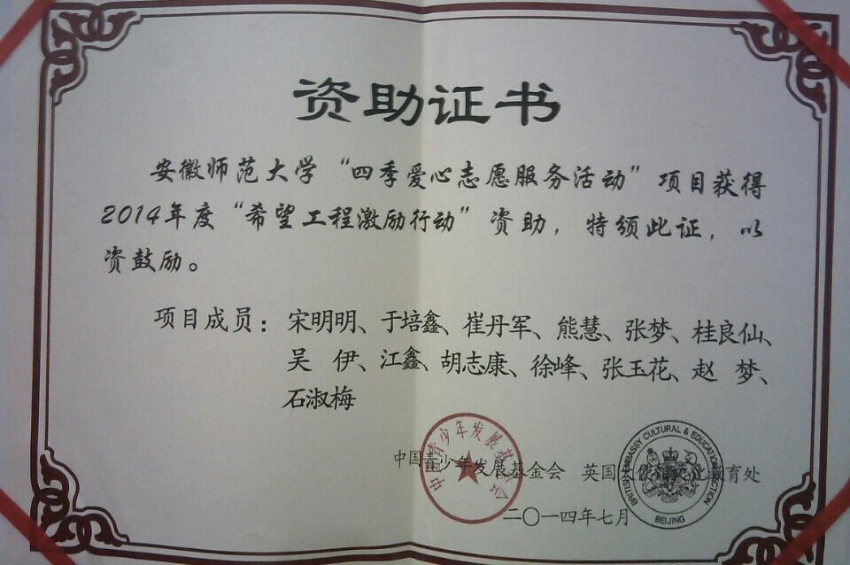本网讯(生科院 志愿者服务队)为传承志愿服务精神,践行社会主义核心价值观,生科院团委指导公司志愿者服务队成功申报由中国青少年发展基金会、英国大使馆文化教育处主办的2014年度“希望工程激励行动”项目。