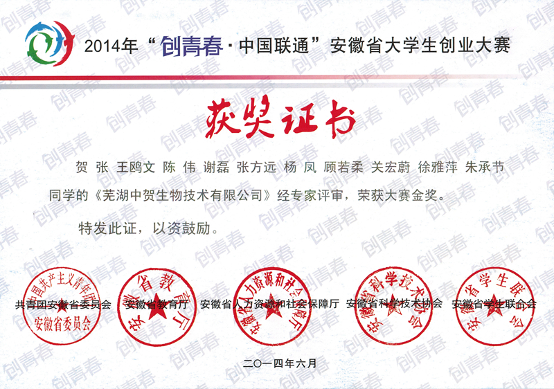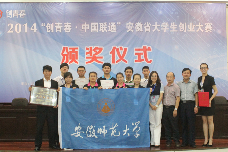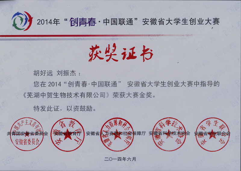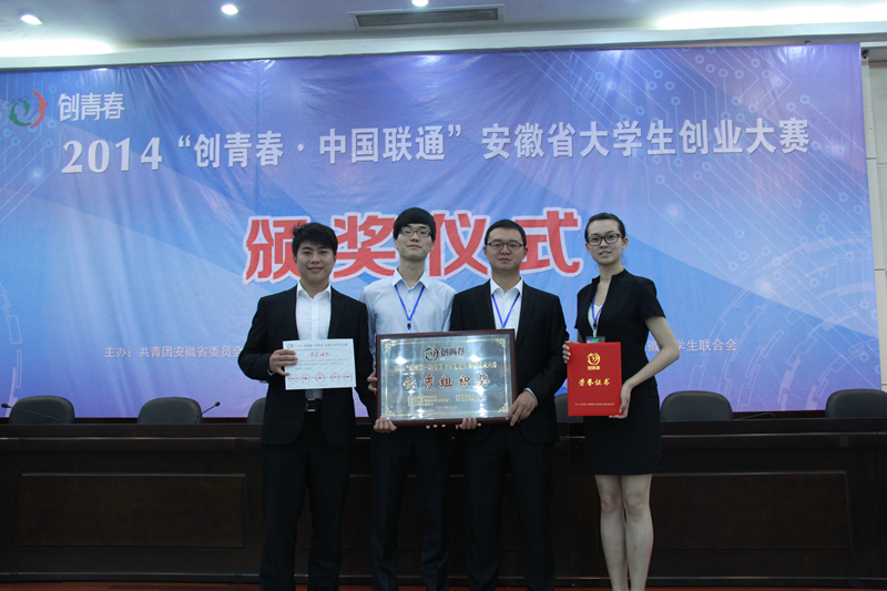 本网讯(生科院黄振新)2014“创青春·中国联通”安徽省老员工创业大赛终审决赛日前在安徽工业大学圆满落幕。生科院学子双双荣获金奖:胡好远、刘振杰老师指导的贺张等人的作品《芜湖中贺生物技术有限公司》获得创业计划竞赛金奖,张建华、井方明老师指导的公司毕业生王雷等人的作品《安徽出众教育文化咨询有限公司》获得创业实践挑战赛金奖。