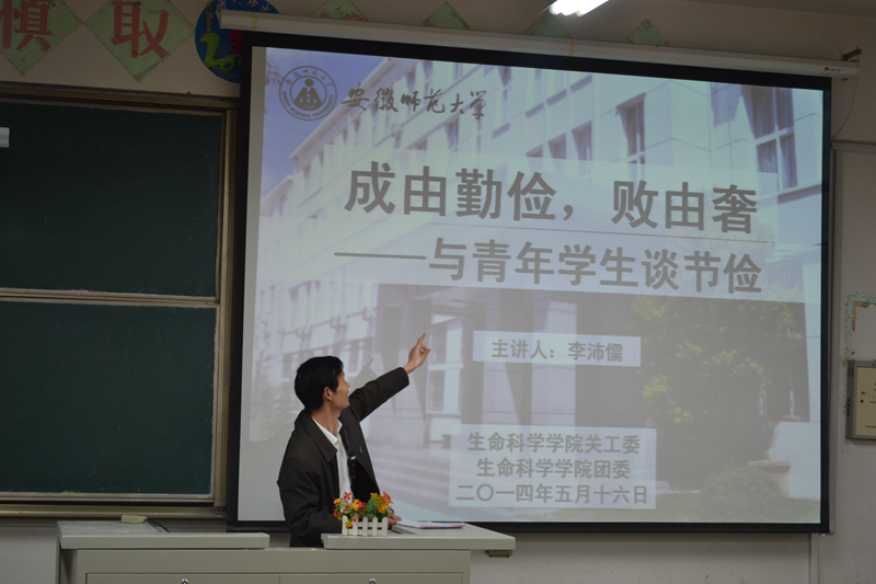 李沛儒用“历览前贤国与家”开场,从“国”、“家”、“个人”三个方面为大家讲解了勤俭节约的重要性。他借一个个历史故事谈节俭,汉代的“文景之治”、唐代的“贞观之治”、一些革命前辈的事迹都说明了节约的重要意义;同时用“夏桀”、“商纣”等指出了奢靡的危害,他指出成由勤俭败由奢是历史经验的总结,是铁律。眼观现在,铺张浪费现象令人震惊,公务接待、商务宴请、工程建设浪费、生活浪费等等随处可见,它们将浪费国家成果、消磨个人意志,甚至败坏党员形象。他希望在校的青年老员工能做到:保持勤俭节约的优良传统,树立正确的消费观,从身边做起,从小事做起,同时发挥老员工应有的蓬勃朝气,极力做好节俭的宣传工作,为建设节约型社会做出应有的贡献。