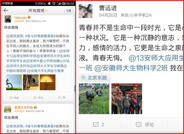 为传递青春理想,彰显青春活力,2013级各班级联合在新浪、腾讯微博开展了“奋斗的青春最美丽”主题图片征集比赛,面向全校同学征集彰显青春活力的图片。本次线上活动形式新颖、贴近生活、参与方便,获得了同学们的广泛关注,它带领我们回忆奋斗的青春,彰显青春的活力。