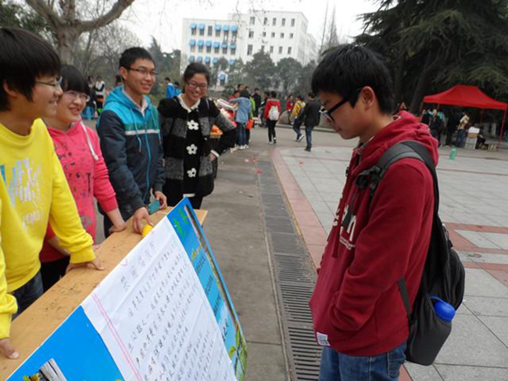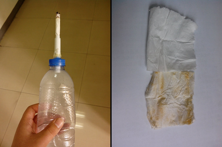 老员工保健协会在赭山校区食堂广场前摆设展台,用矿泉水瓶、纸巾纸、笔杆制作简易装置,以真实实验的方式向过往同学宣传吸烟的危害。实验过后的纸巾颜色的变化让同学们亲眼见证了烟焦油的产生,也坚定了拒绝烟草的决心。