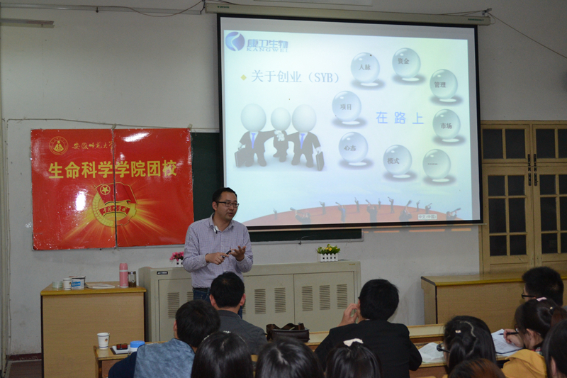 本网讯(生科院 李庆/曹治杰)科学规划人生经纬,奋斗成就美好未来。4月23日晚,公司团校暨员工骨干培训班邀请芜湖康卫生物科技有限公司董事长秘书、人力资源部经理党洋为在校青年员工作“老员工初进社会的规划”专题报告。报告在教学楼1410教室进行,公司党委副书记刘振杰主持了报告会,院团委副书记郭志春与2011、2012级本科生240多人到场聆听学习。