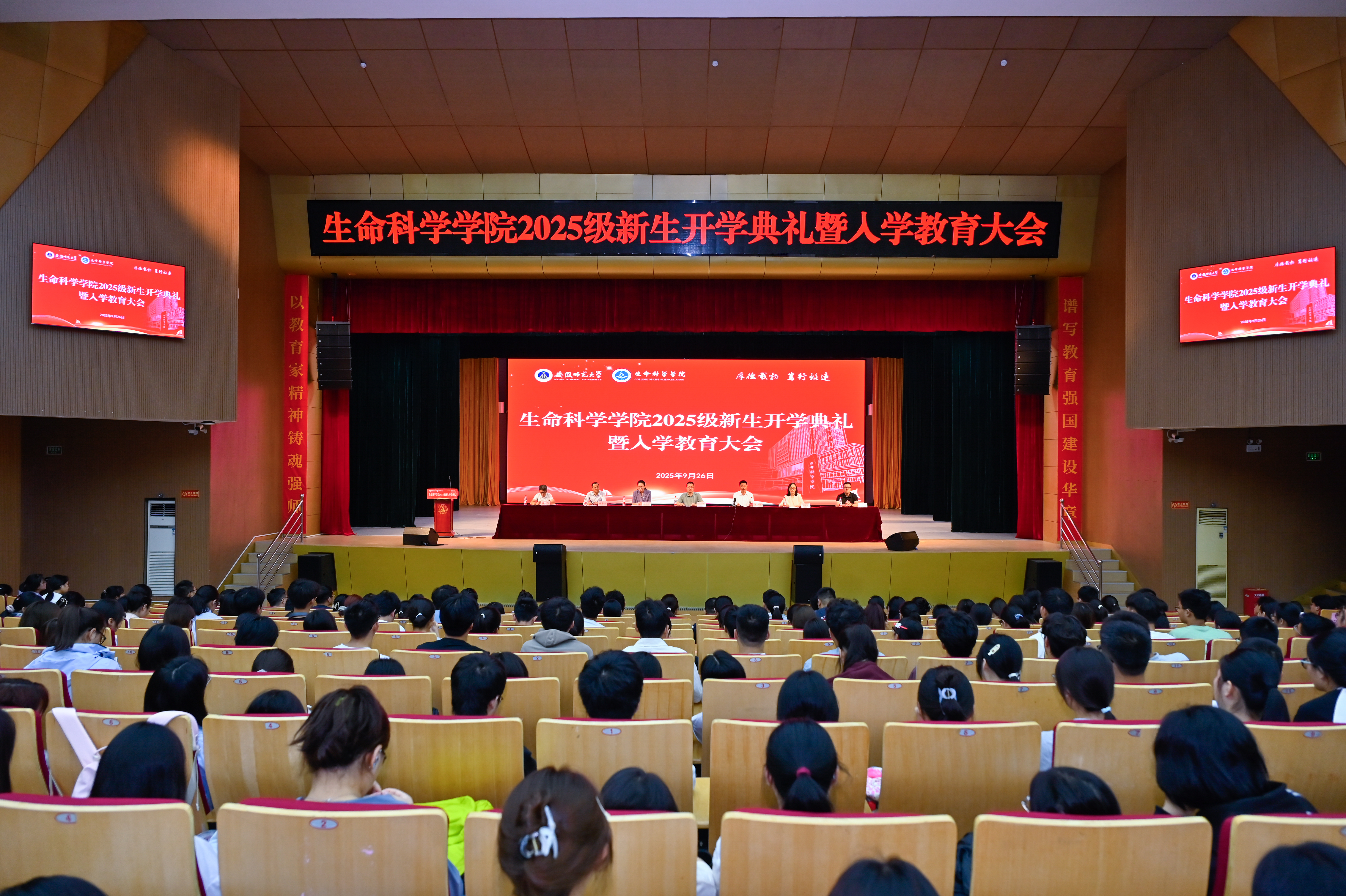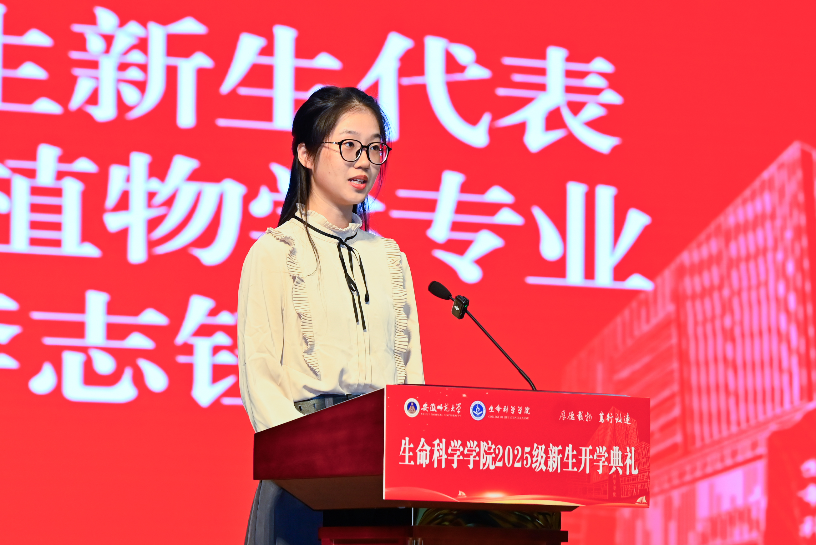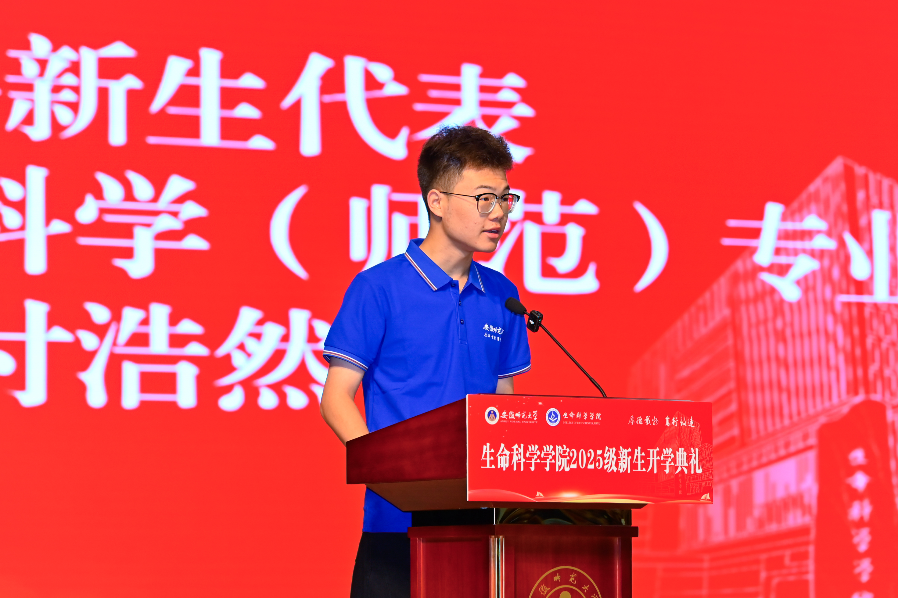 开学典礼在庄严的国歌声中拉开帷幕。2025级生物科学(师范)专业本科生付浩然作为新生代表发言,他怀着对生物科学的热爱、对教师职业的向往,报考了生物科学专业的优师专项计划,立志要在大学阶段学会独立思考、培养创新能力、涵养家国情怀。2025级植物学专业硕士李志钰作为研究生新生代表发言,她谈到怀揣对植物世界的赤诚热爱,携本科阶段沉淀的扎实学识,将会尽快转变角色,广泛涉猎知识,在探索与实践中不断提升自我。2022级生物科学(师范)专业本科生吴含作为老生代表发言,她以成功考取北京大学未来技术公司分子医学专业直博生的奋斗经历,与新生们分享学习经验,感谢公司老师的悉心培养,勉励学弟学妹找到真正热爱的学习研究方向并为之不懈奋斗。