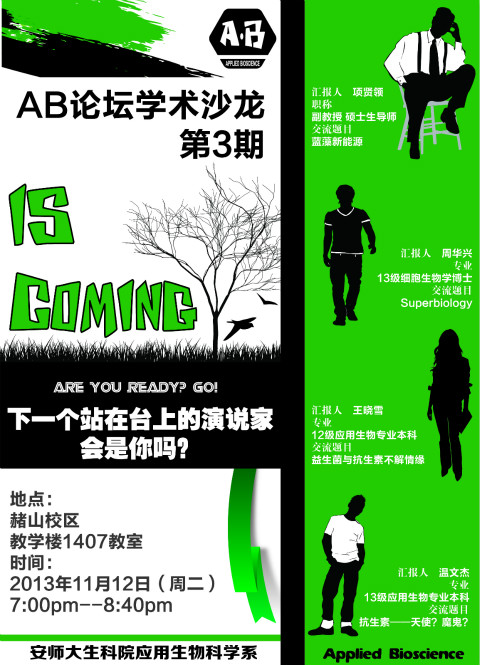 目前,AB论坛作为师生学术自由交流的平台,与会的同学踊跃提问、求知欲强、学术气氛浓,主讲者和听众在激烈的争论中不时蹦出灵感的火花。AB论坛必将为应用生物科学专业的同学搭建锻炼自己展示自己的平台,为他们曾经的“幻想”,插上理性的翅膀飞向美好的明天。