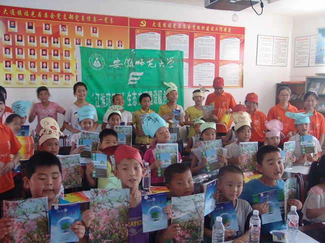 志愿者在芜湖、铜陵两地开设了“环保小使者”训练营,共招募了100余名环保小使者,开展环保宣教活动。志愿者们发放《低碳世界》读本,组织“环保知识竞赛”、“环保绘图征文”,开展“模拟食物链”游戏、“石炭吸污”污水净化处理小实验。小使者们还当起了“环保小老师”,为乡亲们讲解环保知识;拿起相机,学做“环保小记者”。50名小使者还应邀走进生科院标本馆,观看、采集和制作动植物标本。通过培训教育,环保的种子渐渐在孩子们心中发芽生长。