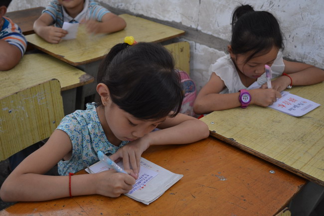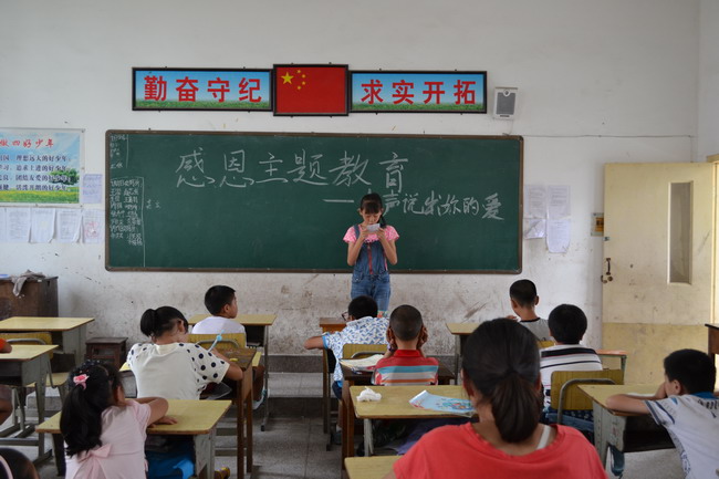 16日,经过精心的准备与安排,志愿者们向孩子们声情并茂地讲述了寓言故事《男孩与苹果树》。苹果树给了男孩一切,而当男孩发觉苹果树的衰老时,苹果树已经死去。“我们不能像男孩一样,对苹果树一味的索取”;“我们要像苹果树对我们一样去保护、浇灌苹果树”。在志愿者的循循善诱下,孩子们慢慢总结出感恩的主题,并踊跃发言畅谈自己的感想。志愿者还给小朋友们布置了帮助家人做一件力所能及的事的作业,并给他们发下纸张,让孩子们写下最想对爸妈、家人、老师、朋友等人说的话,送给自己最想感谢的人。虽然这些孩子还小,但一颗感恩的种子已在他们心田悄然种下。17日,孩子们纷纷登上讲台叙述了自己昨天在家中做的小事,回忆着家人激动的反应,个个都感受到为辛劳的父母分忧的喜悦。随后,一部微电影《父爱》触动了孩子和志愿者们的内心,泪水湿润了他们的眼眶。放学后,二年级的宋佳憶站在空空的教室里,挂着泪痕轻轻地和志愿者说:“我想爸爸了!”原来,她的爸爸为了家庭已经连续两年在外打工没有回家了。“我很想爸爸,他怎么还不回来呀!”童稚的声音,晶莹的泪水,流进了志愿者们的心,也道出了儿女对父母深深的依恋。