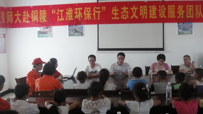 乘车期间,志愿者们就投入到宣传活动当中。他们对乘客进行调研访谈,大力宣传环保思想。下午三点,团队在铜陵市郊区大通镇福光社区举办启动仪式。出席启动仪式的有郊区团委吕禹慧女士、大通镇福光社区团委查德华先生、俞天生女士、生科院志愿服务团队指导老师何所惧和全体志愿者、26名福光社区小员工志愿者。何所惧老师对铜陵团市委、郊区政府和福光社区对志愿服务活动的支持和提供的帮助表示衷心感谢;嘱咐同学们要充分利用暑期社会实践这个第三课堂,发挥老员工的青春热情,深入基层,感受基层,奉献基层。团队志愿者代表和小员工志愿者代表分别作了发言;团队成员为小志愿者们发放了环保杂志。福光社区团委查德华书记对实践团队表示欢迎,感谢公司老员工能够深入社区,为农村的孩子们带去环保理念,为生态铜陵建设作出贡献。