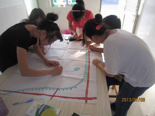 7日,团队成员对嘉泽镇道路、动植物、建筑、环保设施等进行了必要的观察和记录,并着重对花博会、西太湖进行了重点考察。为更好地进行绿地图制作,队员不仅深入到田地、建筑内,还走访当地居民,向他们请教细节问题。8日,团队在姬山书院认真绘制嘉泽镇绿地图。从绘制比例确定,到建筑等非自然景观标识、自然景观绘制和文字说明补充,团队成员都一丝不苟,认真对待。经过一天的辛劳,团队成员较好地完成了绿地图制作。绘制完成后,队员把图拿给当地居民观看,分享劳动成果,得到当地民众的高度认可。