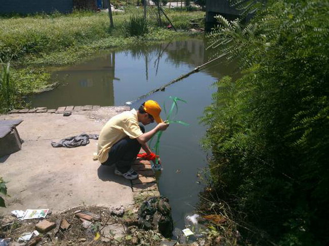 9日,团队又在嘉泽镇进行了水质采样调查。团队成员从姬山书院出发,分别在嘉泽镇四个采样点进行了水质采样。虽然期间遇到了障碍,但是团队成员通过默契的配合,灵活运用身边的材料,最终克服了地理不便等困难,完成了预定任务。活动中,队员还与当地居民进行沟通,了解了造成嘉泽镇湿地污染的原因、湿地演化过程和居民对保护湿地的看法。