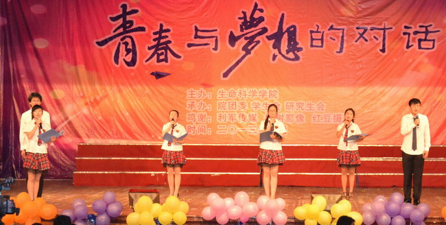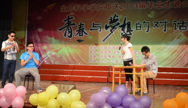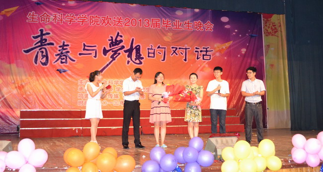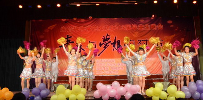 打拼精彩人生,共筑中国梦想。生科院2013届毕业生不仅在考研中取得丰硕成果,更加有付伟等同学走上选调生、老员工村官、支援西部等工作道路。为激励毕业生们扬帆起航,鼓励低年级员工砥砺奋进,院舞蹈团以苍劲有力的舞姿展现出中国崛起的坎坷历程,深刻诠释了当代青年所肩负的实现“中国梦”的《青春使命》;《青春梦·中国梦》则以诗歌朗诵的形式,用振聋发聩的语言呼吁大家用实际行动实现“中国梦”。《祖国之恋》唱出了对祖国的深深爱恋,流露着浓浓的赤子之情。符文倩等同学的扇子舞《待明春》动作舒展大方,表达了对毕业生的深深祝福。舞动青春,放飞梦想。两个多小时的晚会在一曲激昂深情的大合唱《毕业晚会》中顺利结束,整场晚会用高亢激昂的基调把毕业生送上了另一段人生征途。