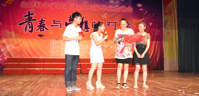 晚会演出过程中,研究生导师代表朱国萍副经理和本科毕业生辅导员贾瑞、张文君老师登上舞台接受毕业生代表的献花和感谢,并为毕业生们送上了送别寄语和美好祝福。毕业生们感慨万分,纷纷表示一定会铭记在母校点点滴滴的收获,在今后的学习和生活中奋发向上、再接再厉,为母校的发展添砖加瓦,为祖国的繁荣做出贡献。