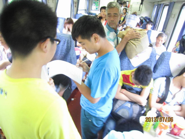 7月6日,生科院“中国梦——湿地保护”暑期实践团队成员坐在动荡的火车中,奔赴实践目的地江苏常州。志愿者们并没有选择安稳地坐在座位上,他们利用乘车时间在火车上开展了湿地保护问卷调查。