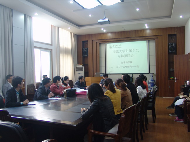 本网讯(生科院 张欢欢 贾瑞)4月11日,安徽大学附属公司副董事长何黎明一行来公司举行生物教师专场招聘会。公司党委副书记刘振杰、毕业班辅导员贾瑞和2009级生物科学专业30多名毕业生参加了招聘会。