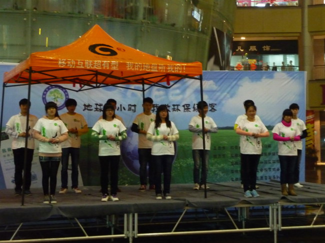 3月23日晚,“地球一小时”活动在芜湖联盛广场举办。志愿者们下午四点半赶到广场进行活动前期准备。晚上六点半,活动在一首《我相信》歌曲中拉开了帷幕,接着小品《超幸福鞋垫》、《王大妈的低碳生活》、《环保时装秀》给大家讲述了日常生活中全新的环保理念,手语表演《一个干净的地球》给人以心灵的震撼,乐器独奏《梦里水乡》给人以听觉享受,活动在志愿者合唱的《关一盏灯》歌声中圆满结束。虽然天空中下着雨,但志愿者们的环保热情却没有因冷雨而降温,整场活动得到了广大市民的极大支持。