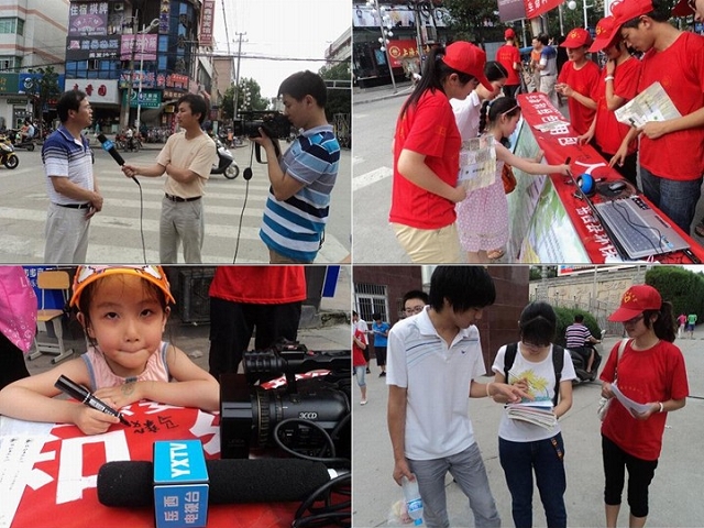 调研团队在岳西县城中心搭起展台、拉起横幅、发放宣传手册,以群众喜闻乐见的形式举办了大型宣讲会。在县城中心广场,队员借助轻松愉悦的文艺表演,调动群众积极性,为全民环保事业做贡献。县教育局书记徐璞、团县委书记聂蓓、生科院副教授涂传林和指导老师贾瑞亲临现场指导工作。