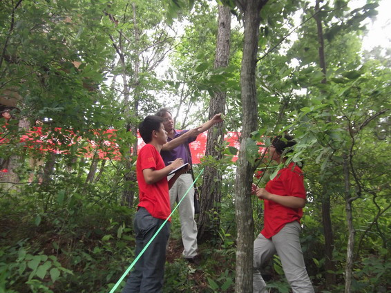 在公司涂传林副教授的指导下,团队成员在多枝尖山麓选取了10m×10m的样方,利用所学专业知识,分批次对鹞落坪的物种丰富度进行了实地调查。队员们对植物进行了仔细地辨别认知,认真记录它们的系统学名,拍摄整体及局部细节照片。对大型树木的多项指标进行准确测量,对树木的基本健康状况进行全面客观描述;同时,还利用GPS定位系统对树木的地理信息数据进行测量,建立鹞落坪古树名木电子档案。