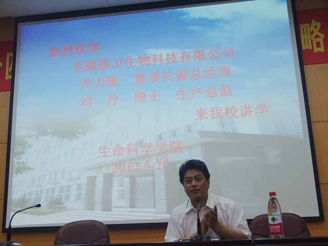 5月25日下午,芜湖康卫生物科技有限公司董事长、总经理井力敏和生产总监、硕士生导师刘丹博士应邀在赭山校区田家炳楼报告厅为生科院师生分别作了励志成长和学术研究报告。生科公司党委书记袁兴龙出席报告会并致辞,副经理朱国萍教授主持报告,部分老师、研究生和生物技术专业本科生参加了报告会。