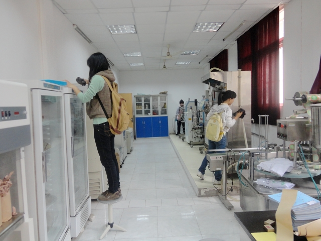 2点20分,105位同学聚集在生化楼前,并按学号分成8个小组分别打扫微生物实验室、发酵中心、细胞实验室等。走进每一个实验室,都能看到同学们忙碌不停的身影。男同学爬到窗台上清理每一个死角并主动承担拖地的任务;由于试验台抽屉不能抽下来打扫,女同学不怕脏乱和玻璃碎屑,伸出双手拣走或抹出每一片废屑;整理药品的同学仔细核对着药品试剂的名称,按照药品的性能仔细分类,擦净摆齐每一罐药品……