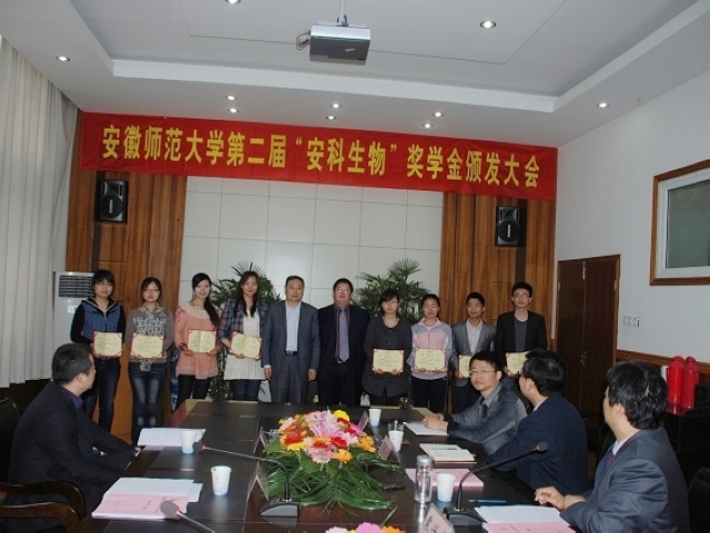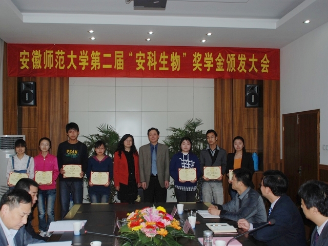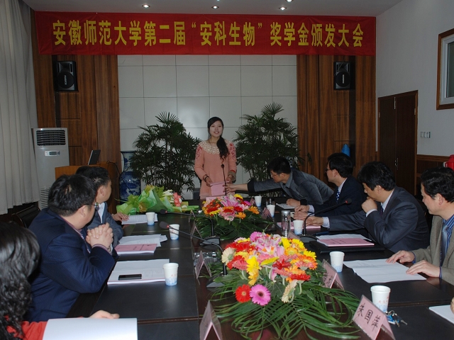 奖学金颁发大会在庄严嘹亮的国歌声中拉开序幕。首先,生科公司党委副书记刘振杰宣读了“安科生物”奖学金表彰决定。接着,与会领导向获奖同学颁发了荣誉证书,获奖同学代表向安科生物公司代表敬献了鲜花,2009级研究生汪楠楠和2008级本科生徐松芝作为获奖代表分别作了发言。