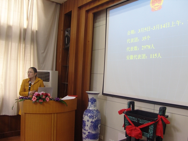 朱国萍向全院教师简要汇报了全国两会的召开盛况和参会感受,重点解读了《政府工作报告》、《全国人大常委会工作报告》、《刑事诉讼法修正案》等在大会上批准和通过的决议、报告,详细通报了今年我国在经济发展、改善民生等方面的重点工作和具体目标,并就十二届全国人大代表名额和选举问题、安徽代表团的参会情况、本人履职情况和相关会议花絮作了简单介绍。