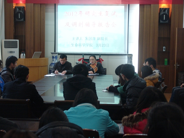 3月23日,生科院在公司一楼会议室举办2012届本科毕业生考研复试及调剂专题辅导报告会,公司科研副经理、博士生导师朱国萍教授应邀主讲辅导,公司党委副书记刘振杰主持,毕业班辅导员朱升学、部分考研同学参加了报告会。
