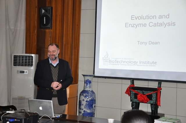 会后,Antony M. Dean教授为本科生、研究生和公司老师作了题为“Evolution and Enzyme Catalysis”的学术报告,介绍了分子生物学相关领域的研究进展,向大家展示了他的最新研究成果,重点讲述了两种新型的酶分子进化机制。Antony M. Dean教授深入浅出的讲解将分子进化的前沿理论描述成趣味生动的科学故事,不仅开拓了员工的科学眼界,更激发了员工学习自然科学、钻研生命科学的兴趣。报告会后Antony M. Dean教授认真地解答了师生提出的问题并与参会老师和员工合影留恋。