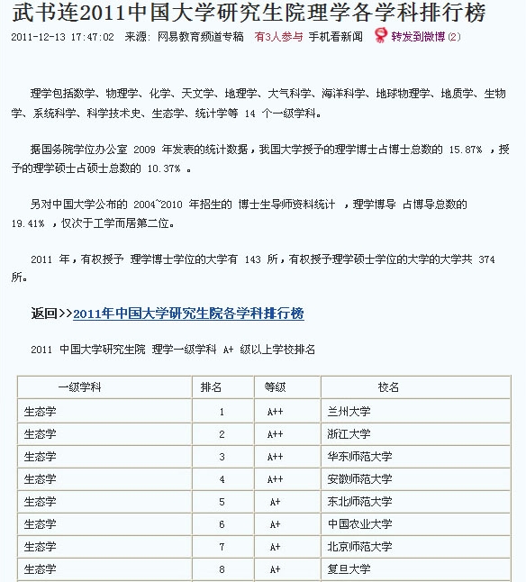 近日,2011中国大学研究生院理学各学科排行榜出炉,公司生态学科在中国大学研究生院生态学科排行榜中位居第四。该排名是根据武书连主编、由中国统计出版社出版的《挑大学、选专业—2012考研择校指南》中2011度中国大学研究生院各学科而来。
