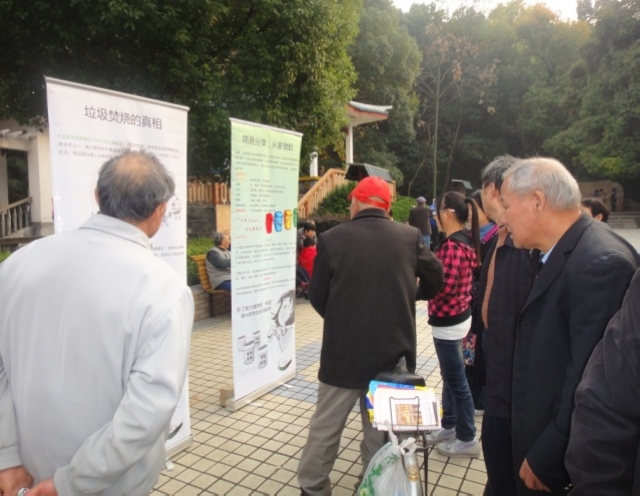 活动现场,生科协理事与党校班学员通过易拉宝、问卷等形式向过往行人介绍了目前国内垃圾处理的现状以及垃圾焚烧的危害,并详细地解答了市民就垃圾议题方面的疑惑。许多市民就绿色生活理念和志愿者们展开了热烈的讨论。一位退休老人说:“这几十年来,我亲眼目睹了环境的变化,回想起来,真叫人触目惊心。其实像这些垃圾有许多是可以回收利用的,只是我们没有做好分类工作。地球是大家的,需要每个人的精心呵护。”