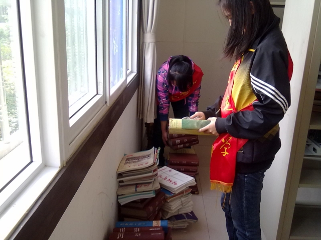 在老师的指导下,志愿者将书籍材料重新分类排序、登记在案,以便查找借阅。整理完毕后,又对资料室每个角落进行了认真彻底的清洁打扫。在先后六次,累计三十多个小时的忙碌中,志愿者们个个热情高涨,不怕脏不怕累。在志愿者齐心协力的努力下,资料室焕然一新:图书井井有条、地面一尘不染。