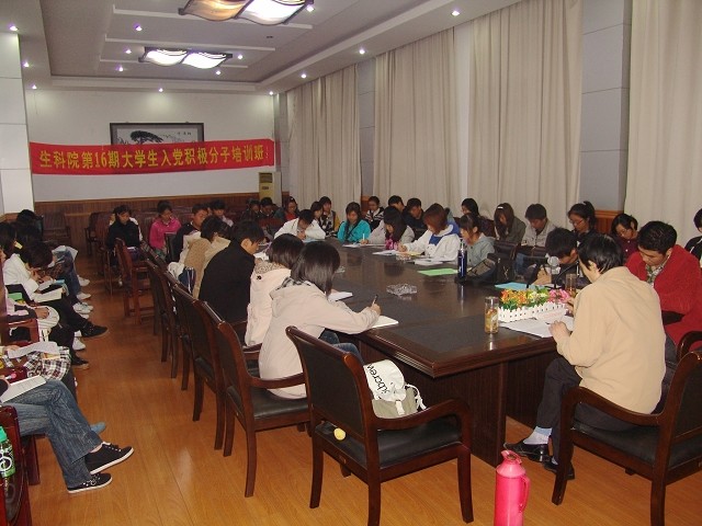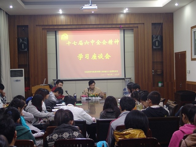 为学习、传达、贯彻党的十七届六中全会精神,10月29日晚,m88官网第16期入党积极分子培训班在生科院一楼报告厅召开十七届六中全会精神学习交流座谈会。生科院关工委常务副主任李沛儒老师及全体学员出席了座谈会。座谈会由培训班班主任李古州主持。