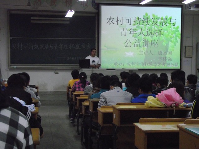 10月29日,m88官网志愿者服务队在田家炳教学楼8103教室举办了“农村可持续发展与青年人选择”安徽省大学巡回公益讲座。主讲人为唐义国、辛林强,近百人到场学习并积极参与讨论。