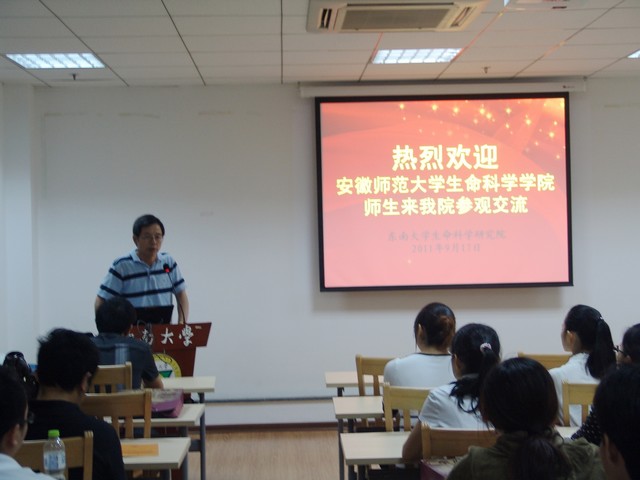 东大生命科学研究院洪宗训书记和研究生辅导员王建梅老师首先带领师大师生参观了东南大学九龙湖校区、四牌楼校区及研究院所属发育与疾病相关基因教育部重点实验室。在接下来的座谈交流会上,研究院谢维经理向大家介绍了东南老员工命科学研究院创建背景、发展目标、运行情况及在高层次人才培养方面的创新举措,介绍了接受外校推免生的一些政策和程序,并对历届考入东大生命科学研究院的安师大生源给予了肯定,同时欢迎更多的安师大生科院同学加盟东南老员工命科学研究院,共同探索生命科学的奥秘。在交流会上,研究院课题组长还分别介绍了各自的研究方向。最后东大生命科学研究院在该校著名的榴园宾馆举行晚宴,盛情款待了安师大师生一行。