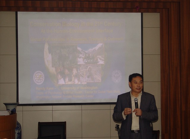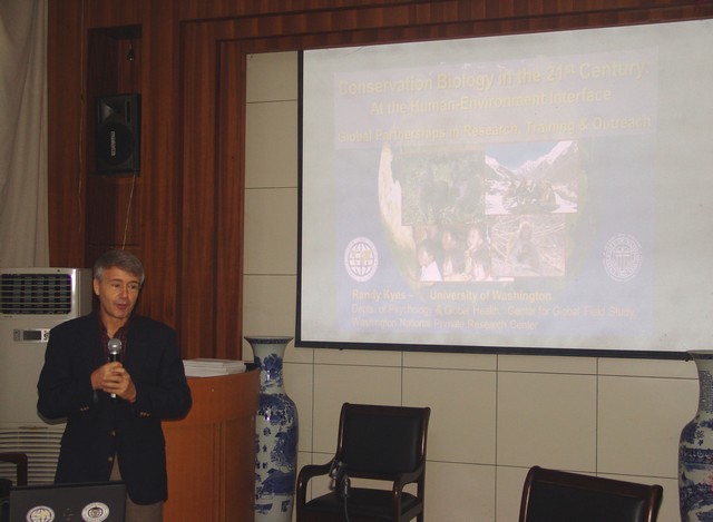 9月30日上午,应生科院邀请,美国华盛顿大学国家灵长类研究中心教授、全球野外研究中心主任Randall C. Kyes博士作了题为《Conservation Biology in the 21st Century: At the Human-Environment Interface, Global Partnerships in Research, Training and Outreach》的学术报告。报告会由李进华副董事长主持,公司有关专业教师、研究生100余人聆听报告会。