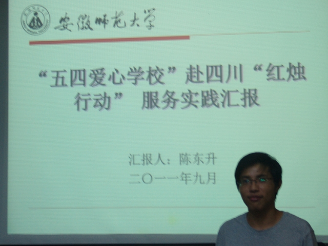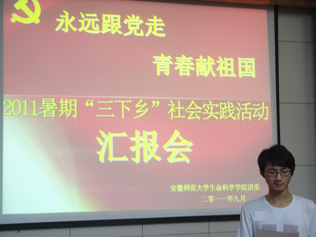 火红的七月,正值酷暑难耐之际,生科学子怀着“永远跟党走,青春献祖国”的激情,踏上了暑期“三下乡”社会实践的征程,把足迹留在了祖国的大江南北。收获的九月,他们在这里汇报成果。以09级为主体的“红烛行动”赴四川洪雅义务支教等4支校级重点团队、“江淮环保行” 赴南陵大浦新农村建设志愿服务等10支院级重点团队以及2支班级重点团队总计16支团队参加了此次的评比汇报会。按照抽签顺序,各团队负责人依次上台用PPT进行展示汇报。他们分别从活动准备、活动主题、活动内容、活动收获、宣传总结等方面对各自团队的实践活动作一一介绍。内容丰富的实践照片,详实清晰的数据统计,科学有据的调研报告,以及声情并茂的演说讲解展现出各团队在实践过程中的点滴与收获。汇报内容精彩纷呈,有爱心志愿服务,有学习红色经典,有科学调研实习,有创建生态安全等。每一个汇报都令人耳目一新,无一不彰显出当代老员工到基层“受教育、长才干、做贡献”而挥洒汗水、奉献爱心的青春风采。