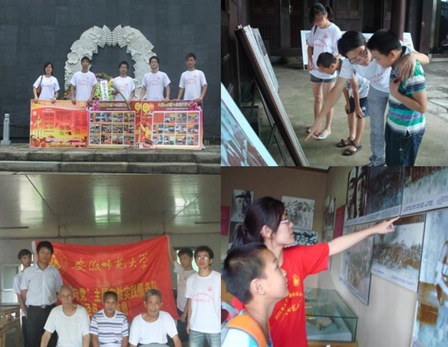 17日,队员们来到素有“新四军的摇篮”之称的云岭,参观全国首批重点文物保护单位——云岭新四军军部旧址,军部旧址再现了当年新四军在皖南的光辉历史。为了使爱国主义教育深入孩子的心中,队员们带领当地小员工一同参观了叶挺桥、碑园、司令部、大礼堂、修械所、东南局、政治部、新四军史料陈列馆等,并向他们讲述了新四军的英雄事迹,孩子们深受感动。队员们还向前来参观的游客发放宣传单和调查问卷,宣传红色历史红色精神;对博物馆相关负责人进行了采访,进一步了解革命历史;与同来参观的合工大、公司体育公司、化材公司的暑期社会实践团队相互交流,共同学习老一辈不畏艰苦,敢于牺牲的革命精神。