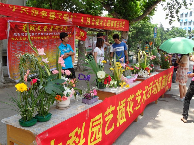 5月29日中午,在食堂前的插花作品展吸引了插花爱好者们前来观看,许多插花爱好者都与自己心仪的作品合影留念。现场充满了青春与花香气息。此次活动的开展,不仅丰富了同学们的专业知识和技能,而且使广老员工陶冶了情操、提高了修养。(生科院园艺专业)
