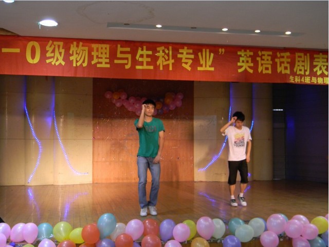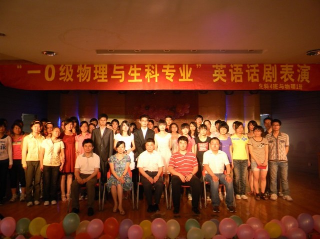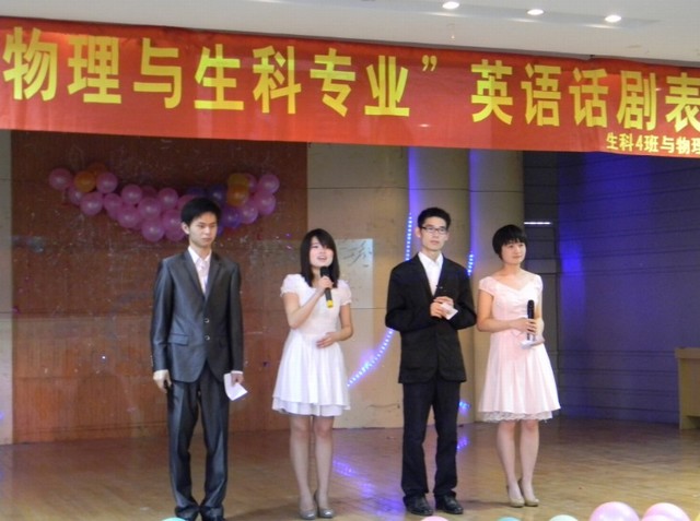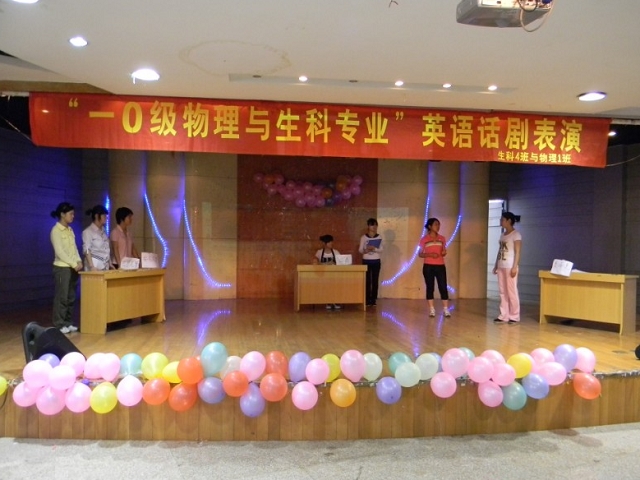 为了增进2010级生科和物电专业之间的交流,增强同学们的英语听说能力,丰富同学们的课余生活。5月7日下午,2010级生物科学教学3班和2010级物理1班在校团委多功能厅联合举办“英语话剧”演出。外国语公司黄朝俊、张小琴老师,10级生物科学辅导员李古州、班主任刘坤,10级物电辅导员倪健等到场观看了表演。