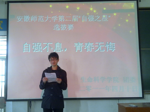 4月10日下午2点生科院在赭山校区教学楼1105教室开展了以“自强不息,青春无悔”为主题的第二届“自强之星”评选活动。院团委副书记贾瑞、员工会主席魏露以及部分员工干部出席本次活动并担当评委。参加评选的同学有:周东东、蔡凌睿、陈枉枉、沈维民、程慧茹、王秀、刘文彪、杨飞等。