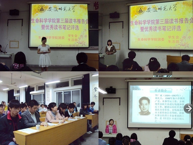 为全面提高青年员工的综合素养,建设内涵丰富、特色鲜明的校园文化,引导团员青年“读经典、学党史、当先锋”,献礼党的90华诞,生科院于4月16日晚在田楼8308教室举办了“第三届读书报告会暨优秀读书笔记评选”活动。公司政治辅导员张文君、李古州老师出席并担任比赛评委。