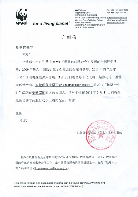由世界自然基金会(WWF)发起的“地球一小时”全球环保活动于3月26日晚拉开帷幕,中国和其他133个国家和地区展开熄灯接力。作为安徽芜湖地区协调单位,安徽师范老员工命科学公司成功举办芜湖市2011“地球一小时”活动。