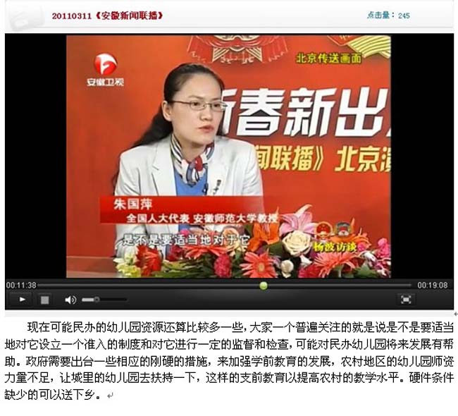 3月10日、11日,安徽卫视新闻联播“两会北京直播室”和“杨波访谈”节目就义务教育、学前教育等问题两次专访了全国人大代表、公司m88官网朱国萍教授。(收看网址:http://www.ahtv.cn/News/ahxwlb/v/tvm/2011-03/11/cms253798article.shtml)