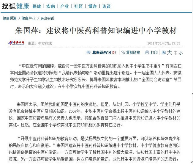 据悉,2011年全国“两会”召开期间,朱国萍教授积极履行自己的职责,提交了多个议案。其中包括加强保护野生中药资源和加强在中小学推并中医药科普知识教育、反对学术造假要减量增质、建议加强中高级职业技术公司建设、鼓励高校建设绿色科学实验室以等,引起了《新华每日电讯》等海内外多家媒体的关注,她先后接受了新华社、腾讯网、新京报、新安晚报、中安在线等10多家媒体的采访。(新闻链接:http://www.ahnu.edu.cn/ahnu/info_read.php?id=92987&cata_0=m88官方网站登录地址&cata_1=新闻中心&cata_2=师大新闻&info_table=info)