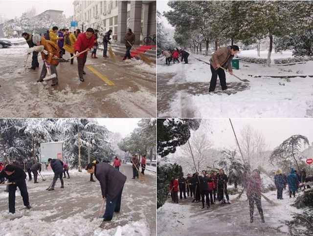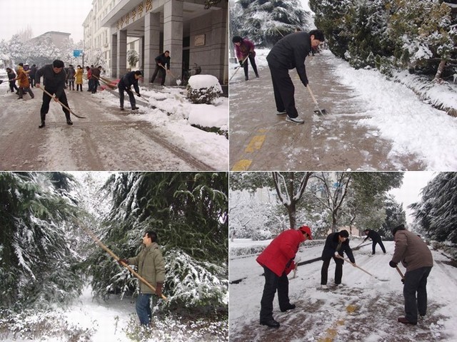 20日下午,接公司抗雪防冰救灾指挥部《关于做好抗雪防冰工作的紧急通知》,生科院紧急组织全院教职工开展清理清理责任区范围内道路和树冠积雪(教学楼周边―西大门(含三幢平房)―物理楼后(含二大楼))。公司领导班子带领教职工手持各种工具,“铁锨、扫把、木棒”一起上,踏着厚厚的积雪,不惧严寒和冰雪,不停的铲雪、扫雪、推雪。大家分工合作,干得热火朝天,虽然室外气温-2℃,但一个个汗流浃背。经过近1个半小时的紧张铲、推、拉、扫,生科院责任区内道路和树木积雪清理完毕。(生科院 李古州)