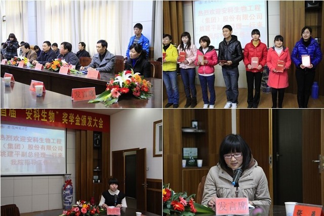 本科生获奖同学代表及研究生获奖同学代表分别进行了发言。她们感谢安科生物工程(集团)股份有限公司和公司对所有获奖同学的帮助和鼓励,并表示要倍加珍惜今天这来之不易的机会,用激情和执着向更高的层次奋进拼搏,营造更和谐、更温馨的校园文化氛围和环境;继续发扬脚踏实地、刻苦钻研的精神,努力拼搏,奋发图强,再创佳绩,用优异的成绩来回报国家、社会和公司。