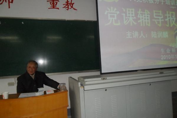 陆润麟老师曾任生物系党总支书记,从事思政工作二三十年,有着丰富的教学经验。辅导课上,陆老师结合切身经历,就端正入党动机、怎样争取入党、如何看待民营资本家入党问题以及就钓鱼岛事件分析中国的外交政策4个问题做了细致深入的讲解。并要求同学们端正入党动机,努力学习,认真履行员工干部的职责,为同学服务,及时向党组织汇报自己的学习工作情况,提高思想政治水平,争取早日入党。
