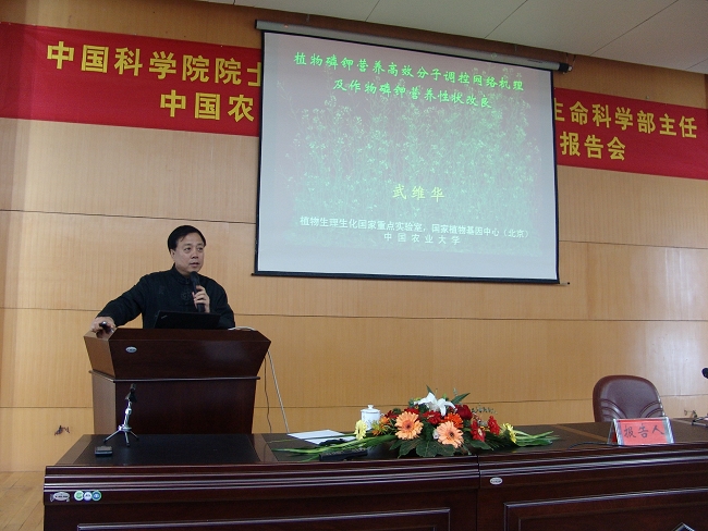 武维华院士在题为《植物磷钾高效的分子遗传调控网络》的报告中结合自己近十年来的研究工作,以拟南芥等为模式植物,从植物磷钾营养高效的分子调控网络机理及作物磷钾营养性状改良等方面深入浅出地讲解了植物磷钾营养高效利用研究情况及其在现代化农业生产发展中的意义和作用。会后,武维华院士认真地解答了师生提出的问题,并欢迎广大师生到植物生理学与生物化学国家重点实验室进行合作交流和学习。武院士渊博的知识和谦逊、严谨、和蔼的态度给现场的老师和同学们留下了深刻的印象,深受启发。武院士用自己的亲身经历告诉我们,作为一名科技工作者就是要勇于面对研究中的困难,刻苦钻研,勇攀科学高峰,创造出更多更好的科研成果为祖国的繁荣发展服务。